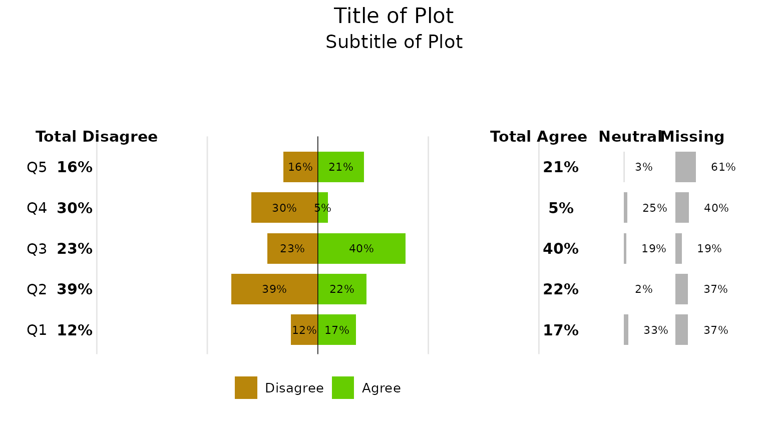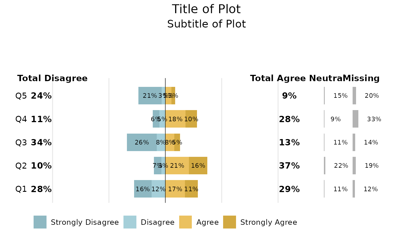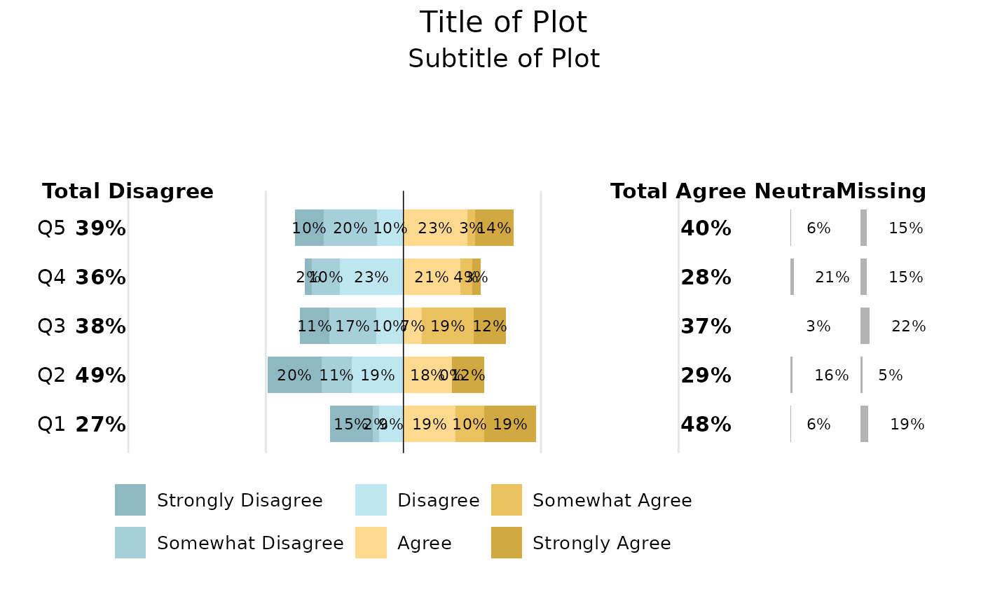 The function will take categories with 2, 4 and 6 levels (excluding any neutral or missing). Here we create a summary table for 6 levels - Strongly Disagree, Somewhat Disagree, Disagree, Neutral, Agree, Somewhat Agree, Strongly Agree)